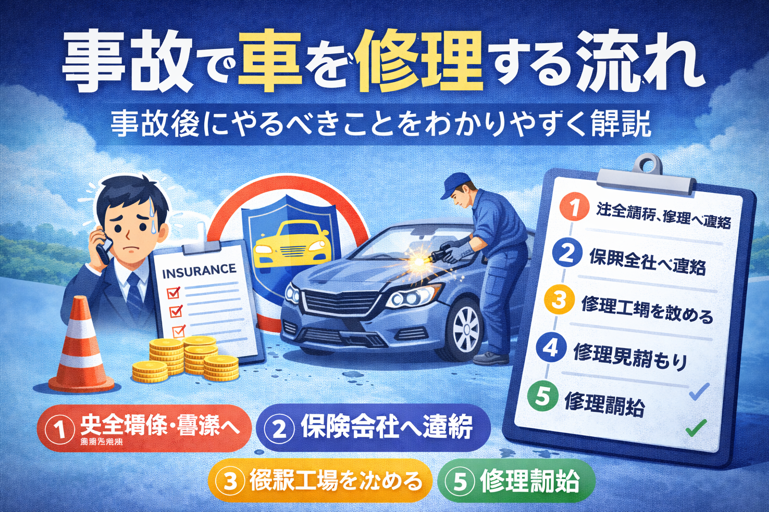 事故で車を修理する場合は、落ち着いて順番に対応することが大切です。