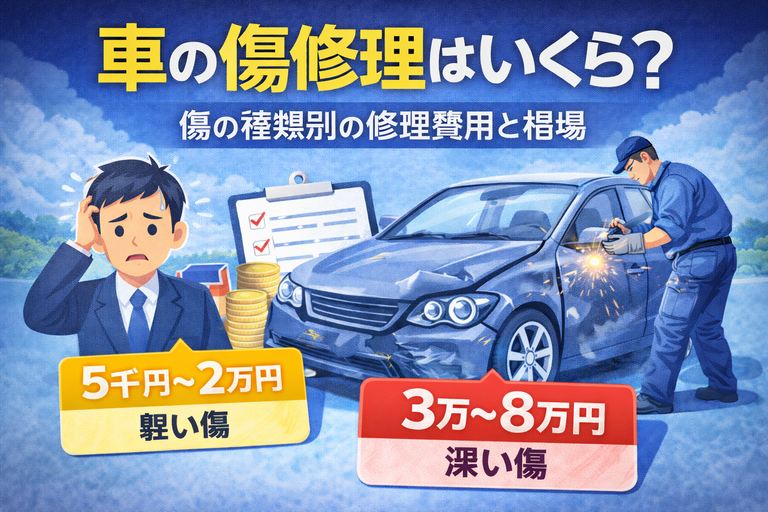 この記事では、車の傷修理の費用目安や修理方法についてわかりやすく解説します。